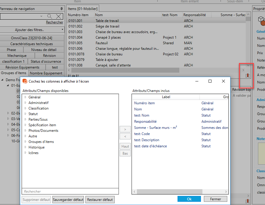 En cliquant droit n'importe ou dans le panneau des items, il y a une option disponible pour ajouter ou retirer des colonnes dans ce panneau. Cela permets à l'utilisateur de choisir quels attributs utiliser pour trier les données.