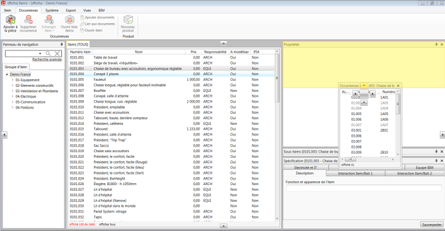Sélectionnez les cases à cocher pour ajouter à l'interface de nouveaux affichages de fenêtres ou sélectionnez Rétablir les valeurs par défaut pour rétablir l'interface dans sa configuration par défaut. Lorsqu'un utilisateur sélectionne une case à cocher, par ex. Caractéristique, elle se présentera sous forme de fenêtre qu'on pourra ensuite disposer dans l'aperçu des items.