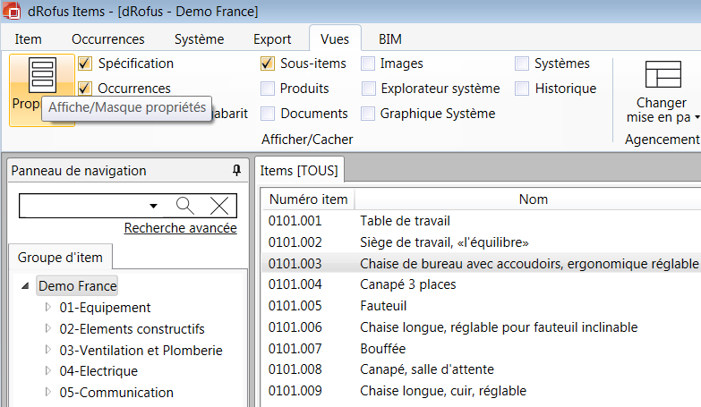 Pour ajouter un nouvel affichage de fenêtre à l'aperçu des items, aller à l'onglet Affichages (Affichages-> Afficher/Masquer).