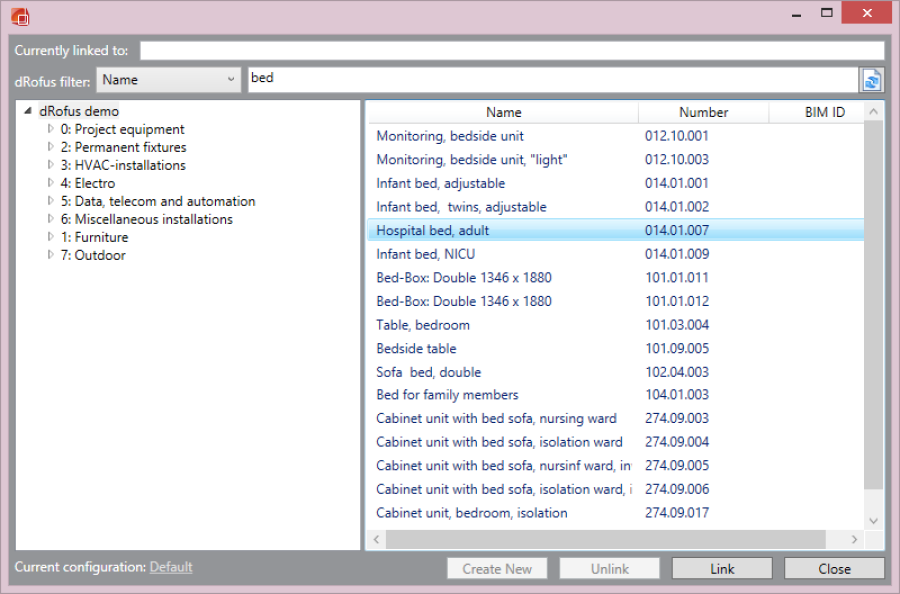 Pour rattacher un objet à un item dRofus, commencer par mettre le panneau dRofus en avant, puis sélectionner un objet dans la maquette. Le panneau vous indiquera si l'objet est rattaché ou non. Pour rattacher l'objet, appuyer sur "Rattacher" sur le panneau. Cette action ouvrira une fenêtre de dialogue ainsi un aperçu des items prévus dans dRofus. Rechercher un item adapté, soit en navigant dans l'arborescence, soit en le recherchant à l'aide d'un filtre dRofus, comme vous l'avez fait pour les pièces (voir Rattacher des zones d'ArchiCAD). Sélectionner l'item et appuyer sur "Rattacher".