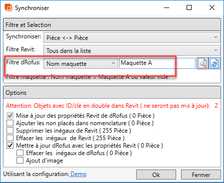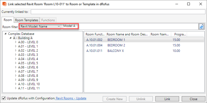 De même, lors de la synchronisation des pièces (déjà liées), le même filtre dRofus pourrait être utilisé. Par exemple: