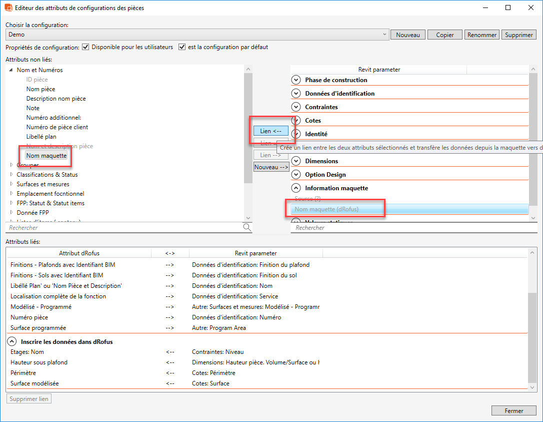 Pour configurer, allez dans l'éditeur de configuration d'attribut et liez le paramètre appelé "Informations sur le modèle> Nom de la maquette (dRofus)" à écrire dans (idéalement) un groupe de pièces nommé "Maquette Revit> Nom" dans dRofus. Vous pouvez choisir n'importe quel attribut accessible en écriture dans dRofus, mais il est recommandé d'utiliser un groupe de pièces afin que vous puissiez facilement visualiser et gérer vos pièces par groupes dans le client dRofus: