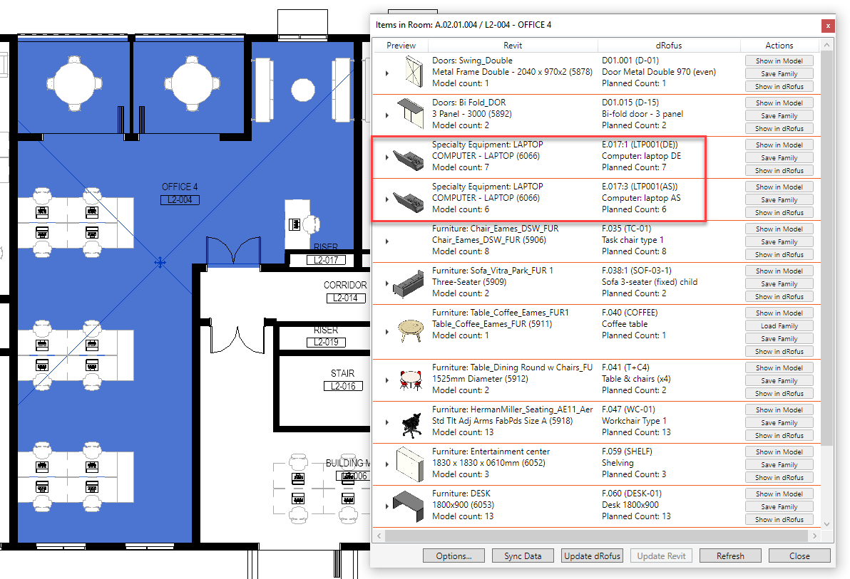 Si vous deviez ensuite afficher ou valider les occurrences de ces ordinateurs dans la pièce Revit à l'aide de la fenêtre «Items dans la pièce» ou «Items par niveau / maquette», le plug-in Revit trouvera en effet la même famille d'ordinateurs portables. Instances (dans Revit) sur les 13 occurrences de l'ordinateur portable enfant (dans dRofus):