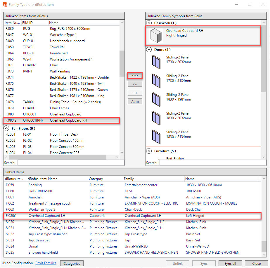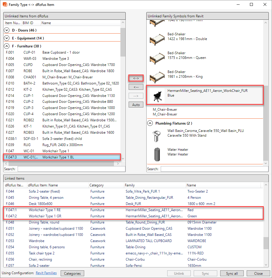 Vous pouvez ensuite lier chacun des deux items enfants aux types de familles correspondants dans Revit, puis placer 3 instances du type de famille qui est articulé à gauche et 4 instances du type de famille qui est articulé à droite dans votre pièce Revit (qui est lié au Labo dans dRofus):