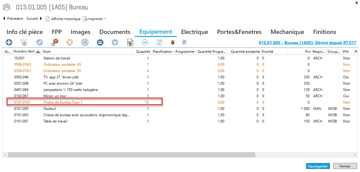 Si vous deviez ensuite afficher ou valider les occurrences de ces chaises dans la pièce Revit à l'aide de la fenêtre "Items dans pièce" ou "Items par niveau / maquette", le plug-in Revit comprendre que la chaise en quantité 13 (comprenant les trois ensembles de types de familles dans Revit) équivaut aux 13 Occurrences des parents (dans dRofus):