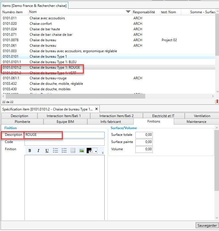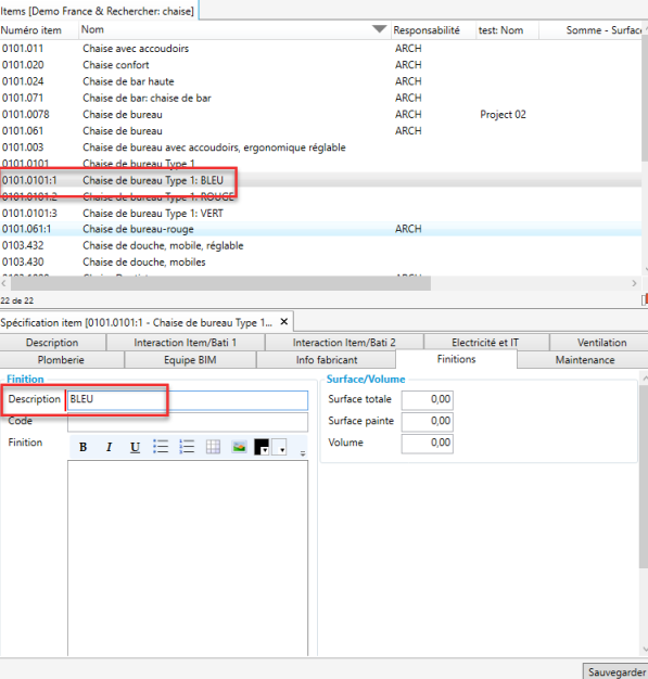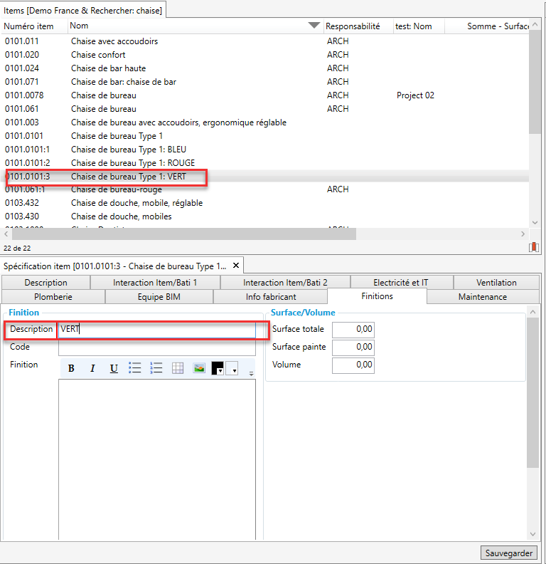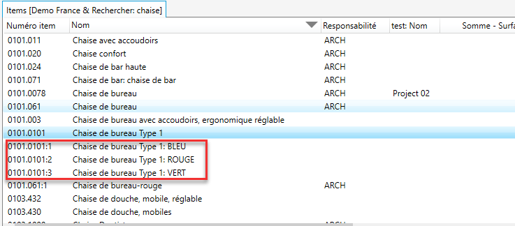 Ce que vous pouvez faire est de créer 3 items enfants basés sur l'item "Chaise de bureau type 1" dans dRofus:
