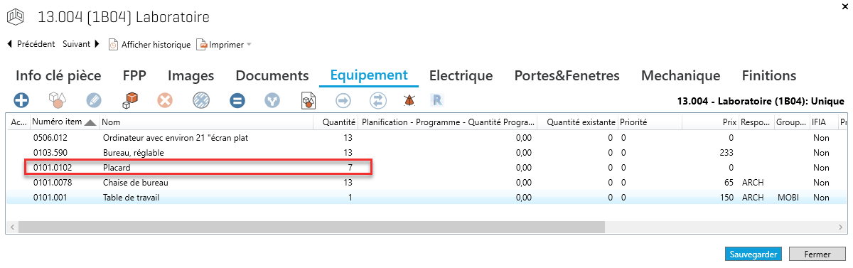 Vous prévoyez 7 placards suspendus pour un bureau dans un projet, donc dans dRofus, vous avez un item appelé "Placard " qui se trouve dans le laboratoire, avec sa quantité définie comme "7":