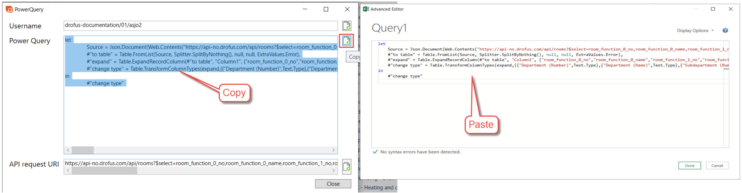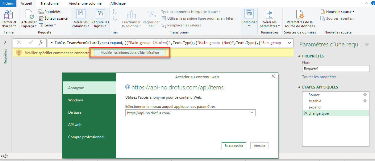 L'authentification PowerQuery est enregistrée sur votre ordinateur, donc si vous envoyez un Excel avec Power Query à d'autres personnes, elles doivent insérer leurs propres identifiants pour pouvoir interroger dRofus.