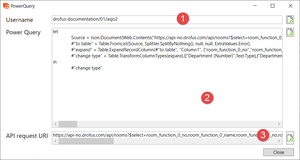 - Le nom d'utilisateur est une combinaison de base de données/identification du projet/nom d'utilisateur personnel. La combinaison correcte peut être trouvée dans la boîte de dialogue PowerQuery de dRofus ;