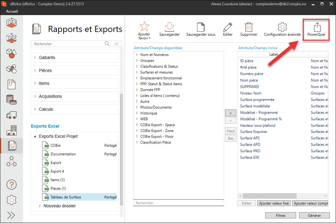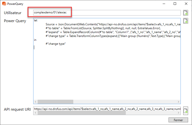 Lorsque vous sélectionnez PowerQuery, un nouveau dialogue s'ouvre avec toutes les informations nécessaires à la création de notre export Excel.