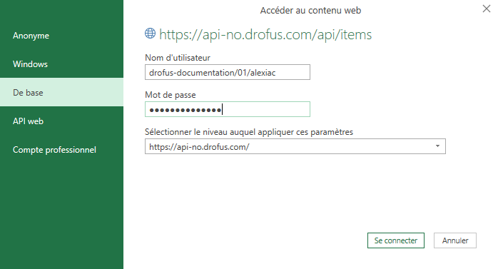 Copiez et collez dans le champ Nom d'utilisateur dans Excel. - Le mot de passe est votre mot de passe habituel de dRofus