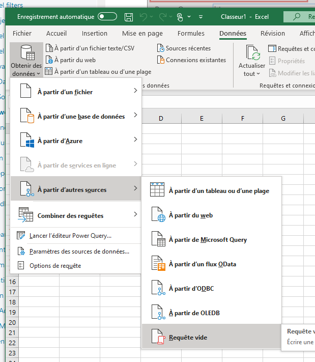 Dans Excel, allez à Données → Obtenir des données → A partir d'autres sources → Requêtes vides :