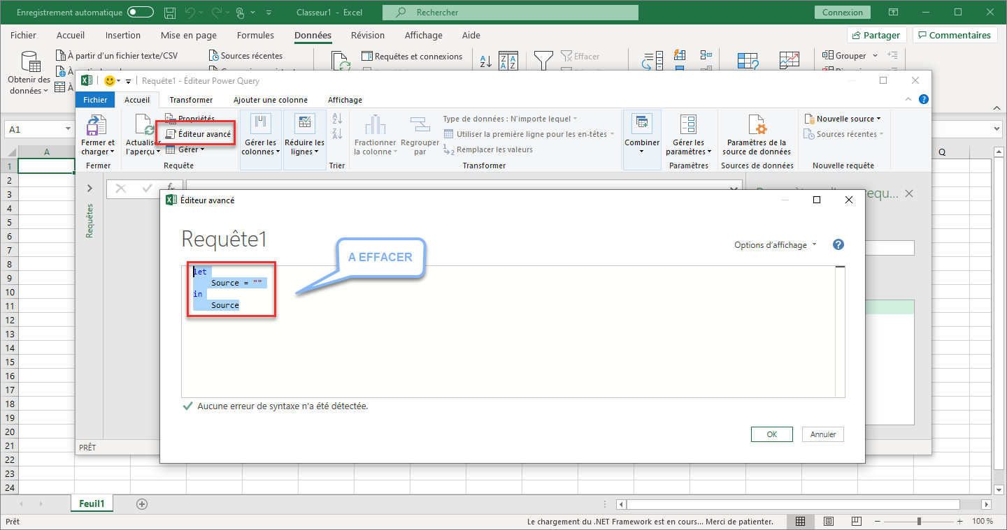 Vous allez maintenant ouvrir le Power Query Editor. Allez à la page d'accueil → Requête → Éditeur Avancé et supprimez tout le contenu de la requête ;