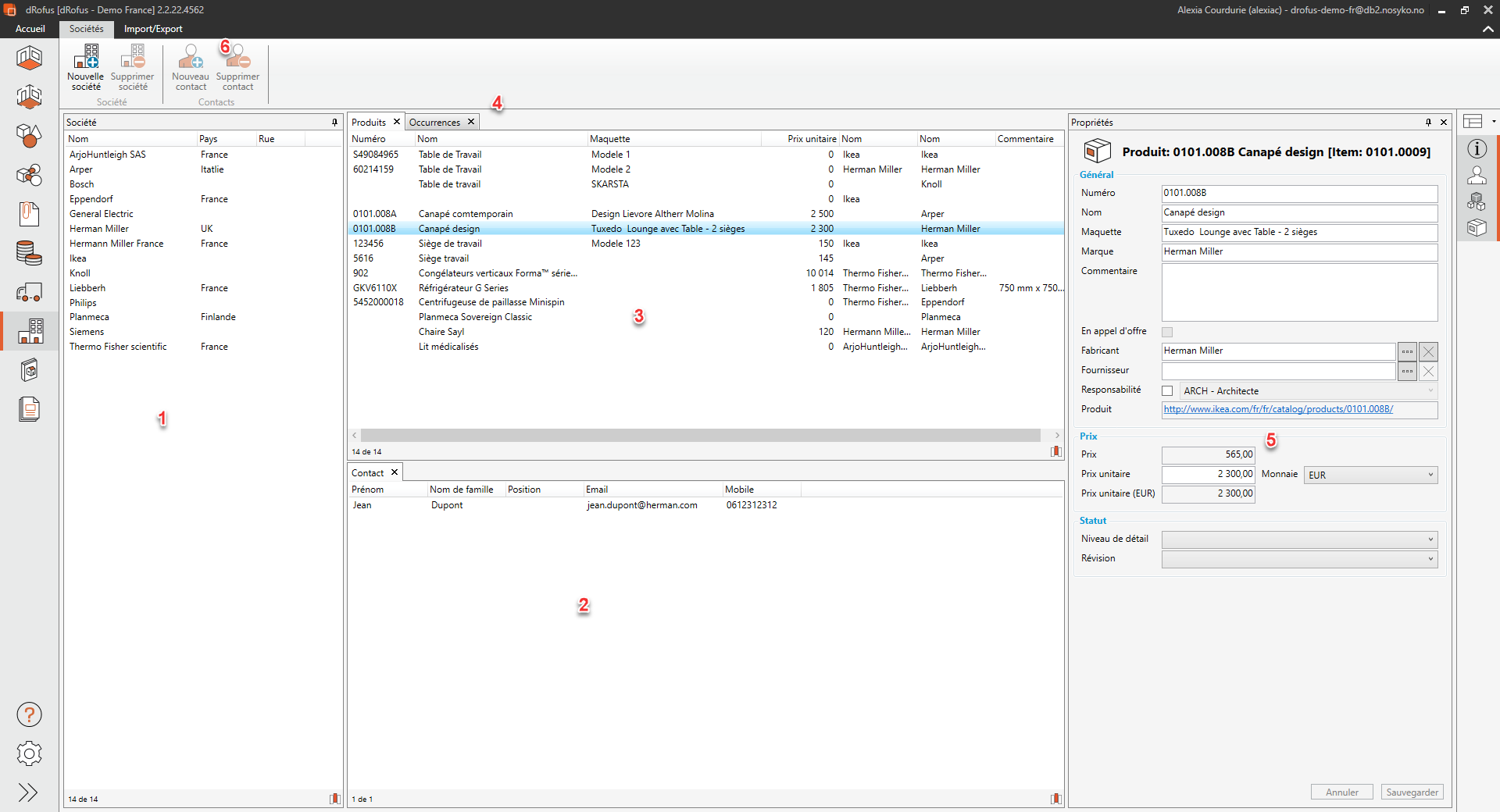 - Propriétés: Fenêtre contextuelle avec des champs modifiables pour la fenêtre en surbrillance (c.-à-d. Contact / Société / Produit / Occurrence de l'article)
