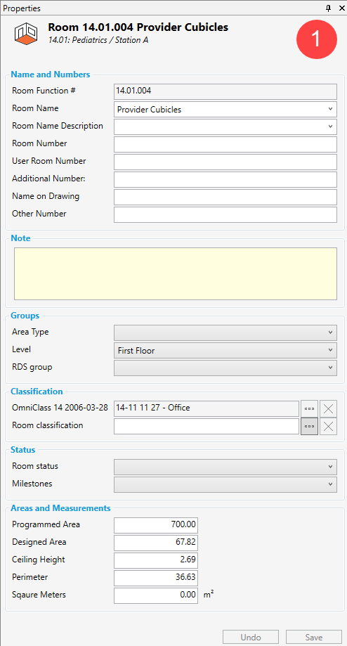 Une pièce possède un certain nombre de surfaces et de mesures uniques. Le projet définira lesquelles et combien d'entre elles doivent être utilisées en plus des valeurs par défaut : la surface programmée et modélisée, le périmètre et la hauteur du plafond.