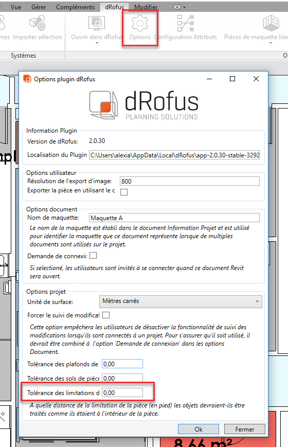 Dans les Options, vous pouvez ajuster les paramètres pour prendre en compte les instances de famille situées en dehors de la limite de la pièce en entrant une valeur de tolérance (en pieds) par rapport à la "Tolérance de limite de pièce":