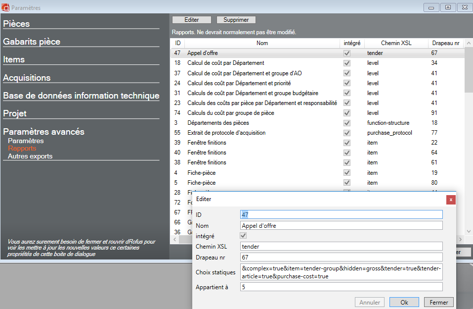 Dans ce menu, vous pouvez changer certaines configuration pour vos rapports lorsqu'ils sont sauvegardés. Dans le champ choix statique vous trouverez les options que vous avez sélectionné avant l'enregistrement vous pourrez les changer si besoin sans avoir a réenregistrer les configurations.