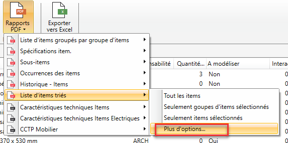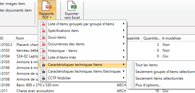 Une option "Rapport PDF" est disponible dans le menu du ruban "Import / Export" qui fournit une sélection de rapports PDF.