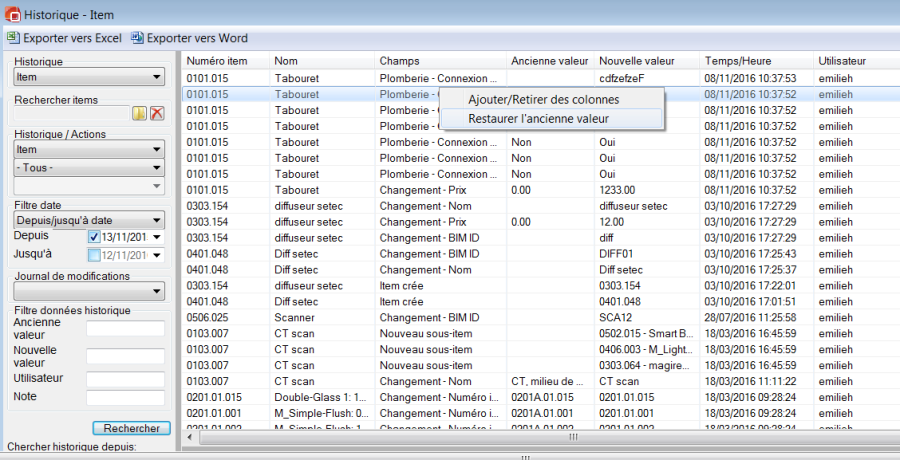 Cette option rétablira la ligne Historique sélectionnée à son ancienne valeur. Vous pouvez appliquer cette fonction à toutes les caractéristiques de l'item, mais elle n'est pas disponible pour les « spécifications des pièces » ni pour les « items dans la pièce/quantités. » (Puisque pour les pièces le facteur Gabarit intervient et rend la manip arrière beaucoup plus subtile).