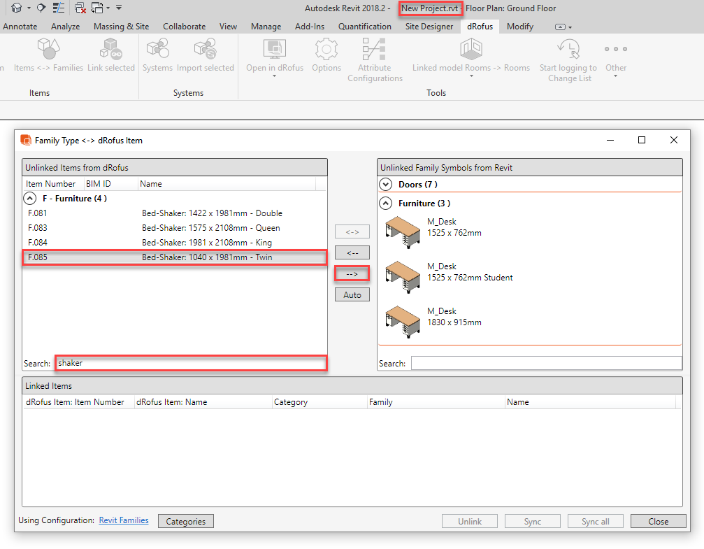 Avoir effectué "Télécharger des fichiers de famille Revit vers dRofus" est particulièrement utile s'il existe un autre projet Revit (utilisant la même base de données dRofus) et que vous devez charger ces mêmes types de familles dans l'autre projet Revit. Une fois que vous avez ouvert l'autre projet Revit ("Nouveau projet"), vous pouvez parcourir ou rechercher puis sélectionner l'élément dRofus (qui a été téléchargé avec le fichier Famille Revit correspondant du projet Revit original) sur le côté gauche, puis cliquer sur sur "->":