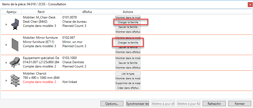 Pour une gestion plus efficace du chargement des fichiers de famille, vous pouvez utiliser la boîte de dialogue Items <-> Familles. Si vous avez lié des types de familles Revit avec des objets dRofus, ceux-ci seront listés dans la partie inférieure de la boîte de dialogue, où vous pourrez les synchroniser en utilisant "Synchroniser" ou "Tout Synchroniser":