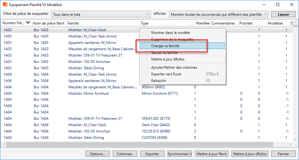 Lorsque vous sélectionnez une pièce et que vous choisissez "Items dans la pièce", une liste d'items dans la pièce comparant Revit et dRofus s'affiche. Lorsqu'un type de famille Revit est lié à un item dRofus, vous avez le choix entre plusieurs options supplémentaires. L'une des actions est "Télécharger la famille". Cette action charge et / ou met à jour le fichier Revit Family (associé à l'item lié correspondant dans dRofus) dans le projet Revit en cours. Bien sûr, cela n'est possible que lorsque les fichiers de la famille ont déjà été téléchargés: