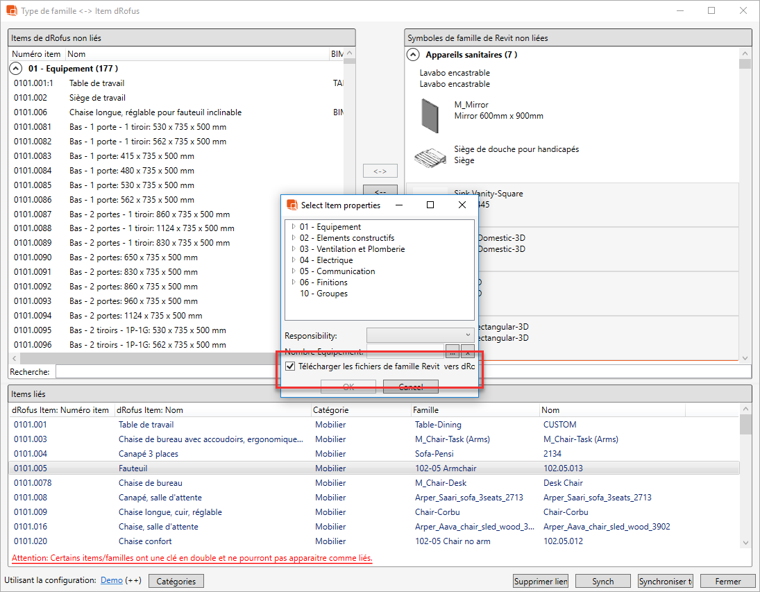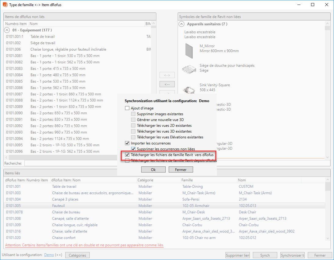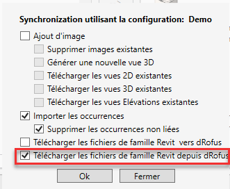 Dans la boîte de dialogue Items <-> Familles, lors de l'import / liaison d'items dRofus de la liste des types de familles non liés, vous pouvez également cocher la case "Télécharger les fichiers famille Revit dans dRofus":