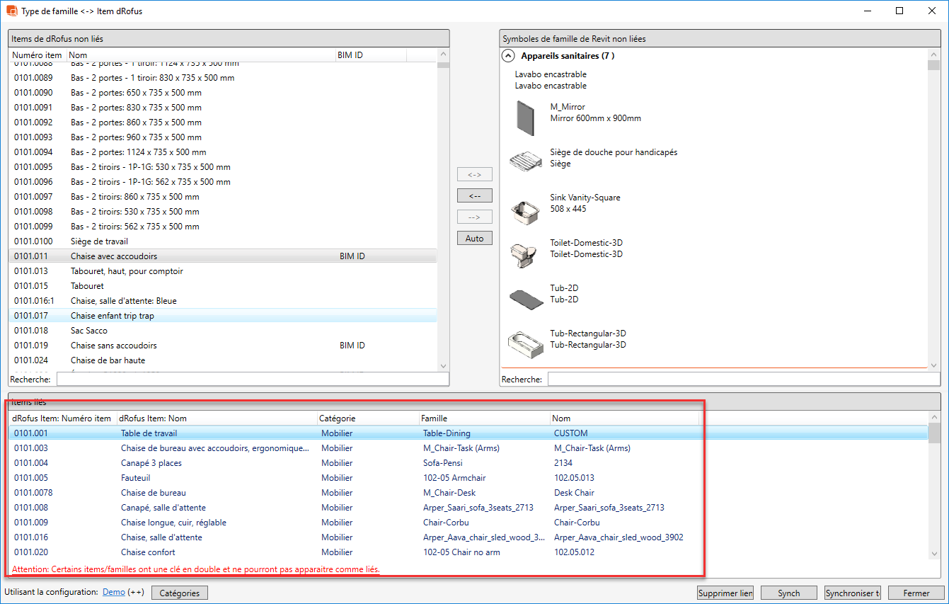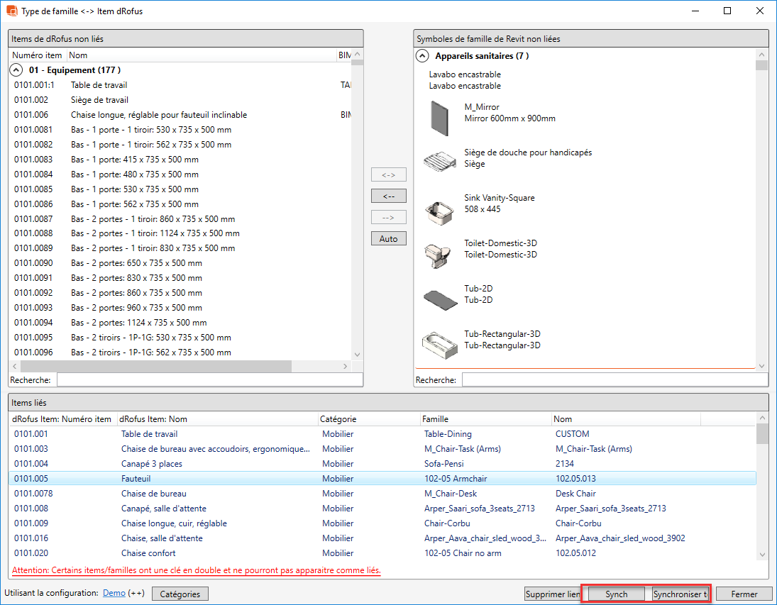 Pour une gestion plus efficace de la sauvegarde des fichiers de famille, vous pouvez utiliser la boîte de dialogue Items <-> Familles. Si vous avez lié des types de familles Revit avec des objets dRofus, ceux-ci seront listés dans la partie inférieure de la boîte de dialogue, où vous pourrez les synchroniser en utilisant "Synchroniser" ou "Tout Synchroniser":