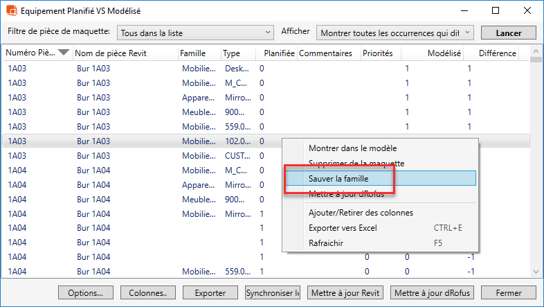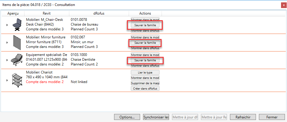 Lorsque vous sélectionnez une pièce et que vous choisissez "Items dans la pièce", une liste d'items dans la pièce comparant Revit et dRofus s'affiche. Lorsqu'un type de famille Revit est lié à un item dRofus, vous avez le choix entre plusieurs options supplémentaires. L'une des actions est "Sauvegarder la famille". Cette action télécharge le fichier de la famille Revit en tant que document associé à l'item dans dRofus: