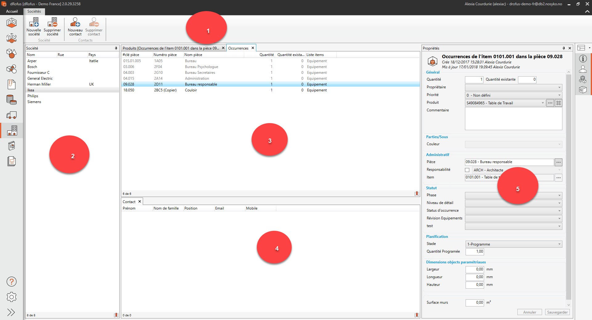 - Produits/Occurrences : Liste des produits livrés par entreprise sélectionnée. Vous pouvez également voir à quelles pièces l'entreprise va livrer des produits, dans le volet Occurrences. Sélectionnez un produit pour éditer les détails du produit dans le volet Attributs.