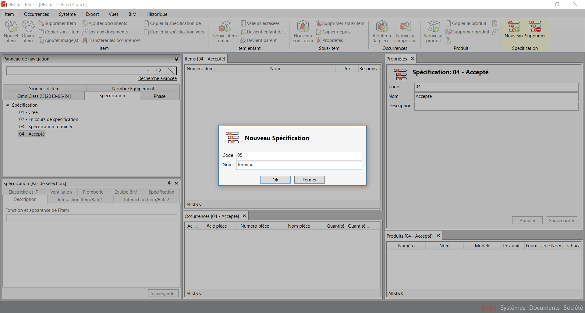 L'administrateur doit ensuite aller dans le panneau de navigation des statuts pour définir les étapes de chaque processus de travail. Par exemple,pour ajouter une nouvelle étape - terminé - au processus de spécification des Items, l'utilisateur a choisi "Nouveau" en haut à droite, pour ajouter les propriétés au statut "05 - fermé":