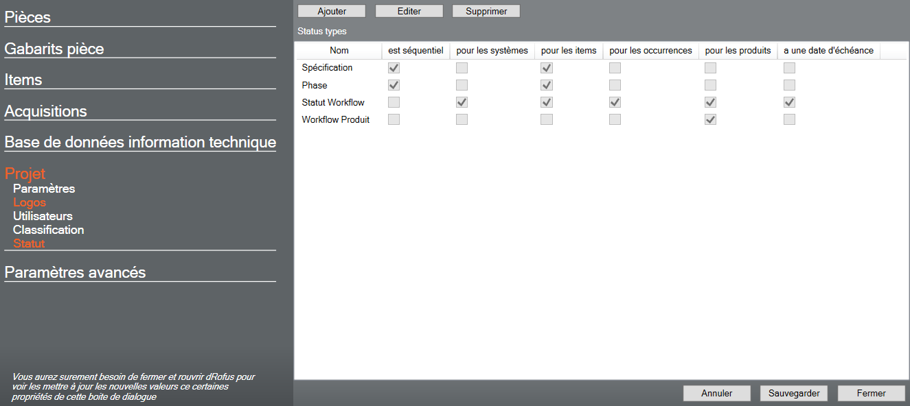 C'est l'administrateur du projet qui a l'accès nécessaire pour créer les statuts. La procédure est expliquée ci-dessous afin que l'utilisateur qui a besoin d'un nouveau status connaisse les choix qui s'offrent à lui.