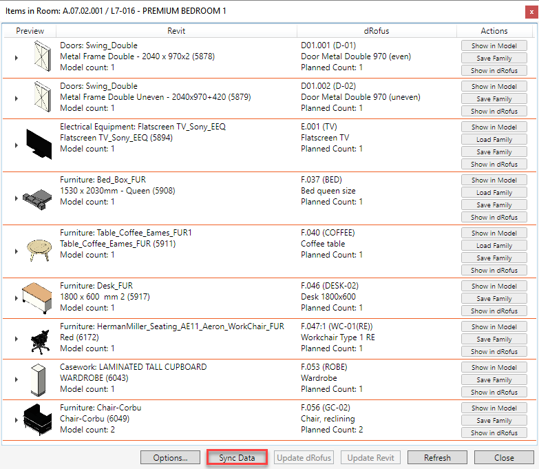 Pour en savoir plus sur la synchronisation des données de l'Instance familiale avec les données de l'Occurrence de l'élément sur une base individuelle dans le dRofus Panel, cliquez ici :dRofus Panel Family Instances Action Icons.