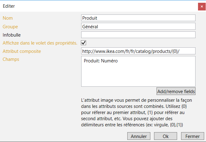 - Texte composite: Définit la façon de composer les champs choisis dans le nouvel attribut. Le texte peut être personnalisé en utilisant {0} pour désigner le premier champ de la liste des champs, {1} pour désigner le second champ etc.. Vous pouvez ajouter des délimiteurs entre les champs (par exemple, URL, - / etc.)