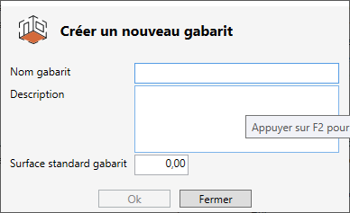 Pour créer un nouveau gabarit, sélectionnez Nouveau gabarit, avec le type de gabarit, sélectionné. Par exemple, pour créer un nouveau gabarit de pièce, sélectionnez d'abord le code Type de gabarit de pièce. Lors de la création d'un nouveau gabarit, le nom et la description du gabarit doivent être remplis, mais le préfixe/code n'est pas nécessaire et sera automatiquement créé en fonction des paramètres par défaut définis dans les paramètres des gabarits. Ces valeurs peuvent être modifiées dans les propriétés du gabarit si elles diffèrent du préfixe/code par défaut créé par le processus automatisé.