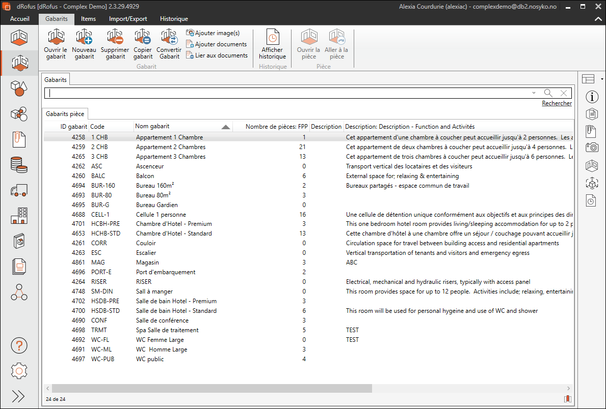 Gabarit Pièces - Gabarits qui incluent les propriétés de la pièce (surface programmée, classifications, groupes), les données de la pièce et la liste des items.