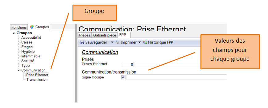 Les types de groupes et les groupes sont créés sous l'onglet "Groups" (Groupes) que vous trouverez à côté de l'onglet "Fonctions" (Départements) dans la liste des pièces. Pour créer un nouveau type de groupe, faites un clic droit sur "Groups" (Groupes) et sélectionnez "Nouveau type de groupe". Vous pourrez alors attribuer un nom au nouveau type de groupe, par exemple "Zone climatique". À droit de l'écran, vous verrez deux onglets. L'un s'appelle "Pièce" et l'autre "Type de groupe". Sous l'onglet Pièce, vous verrez une liste des pièces qui sont rattachées à ce type de groupe. Sous "Type de groupe", vous pouvez ajouter des descriptifs du type de groupe dans le champ textuel de "Descriptif" et vous pourrez définir les règles à appliquer à ce type de groupe. En cliquant sur "Modifier les champs", vous verrez apparaître une boîte de dialogue qui vous permettra de choisir les champs de FPP à inclure. Vous pouvez choisir d'inclure des onglets entiers ou des champs isolés soit en double-cliquant sur l'onglet/les champs, soit en utilisant la flèche située au centre de la boîte de dialogue. Les champs qui ont été inclus figureront sur le côté droit sous forme de liste. Une fois que vous avez sélectionné tous les champs concernés, enregistrez vos modifications en cliquant sur le bouton "Save". Vous avez alors défini les champs de règles à inclure dans ce type de groupe.