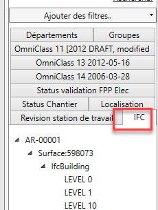 Niveau IFC: Projet/site/batiment/étage: Affiche tous les objets situés dans la zone sélectionnée, donc l'ensemble du bâtiment si vous êtes sur le bâtiment ou l'étage si vous êtes sur un étage. Vous pouvez mettre en évidence les différentes pièces en rouge en cliquant dessus dans la liste des pièces.