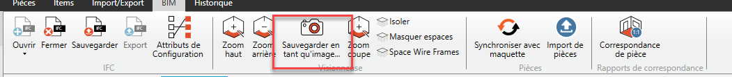 Vous pouvez également enregistrer l'image directement dans le projet, la fonction ou la pièce en sélectionnant ce que vous voulez enregistrer et en cliquant sur le symbole de la caméra dans le ruban du menu supérieur sous "BIM" :